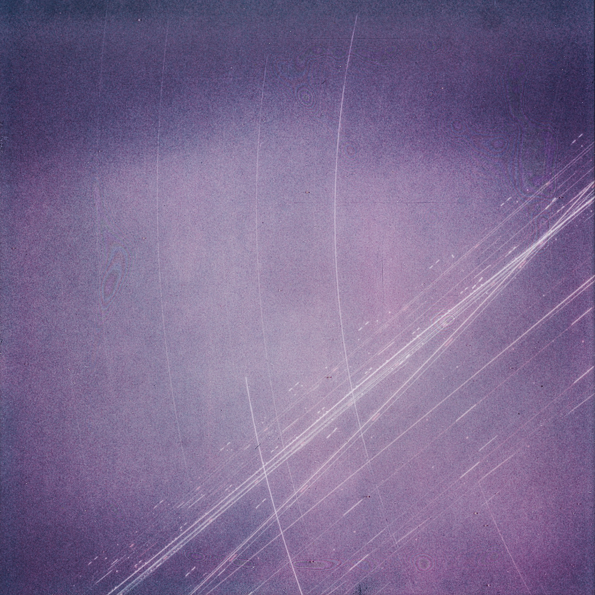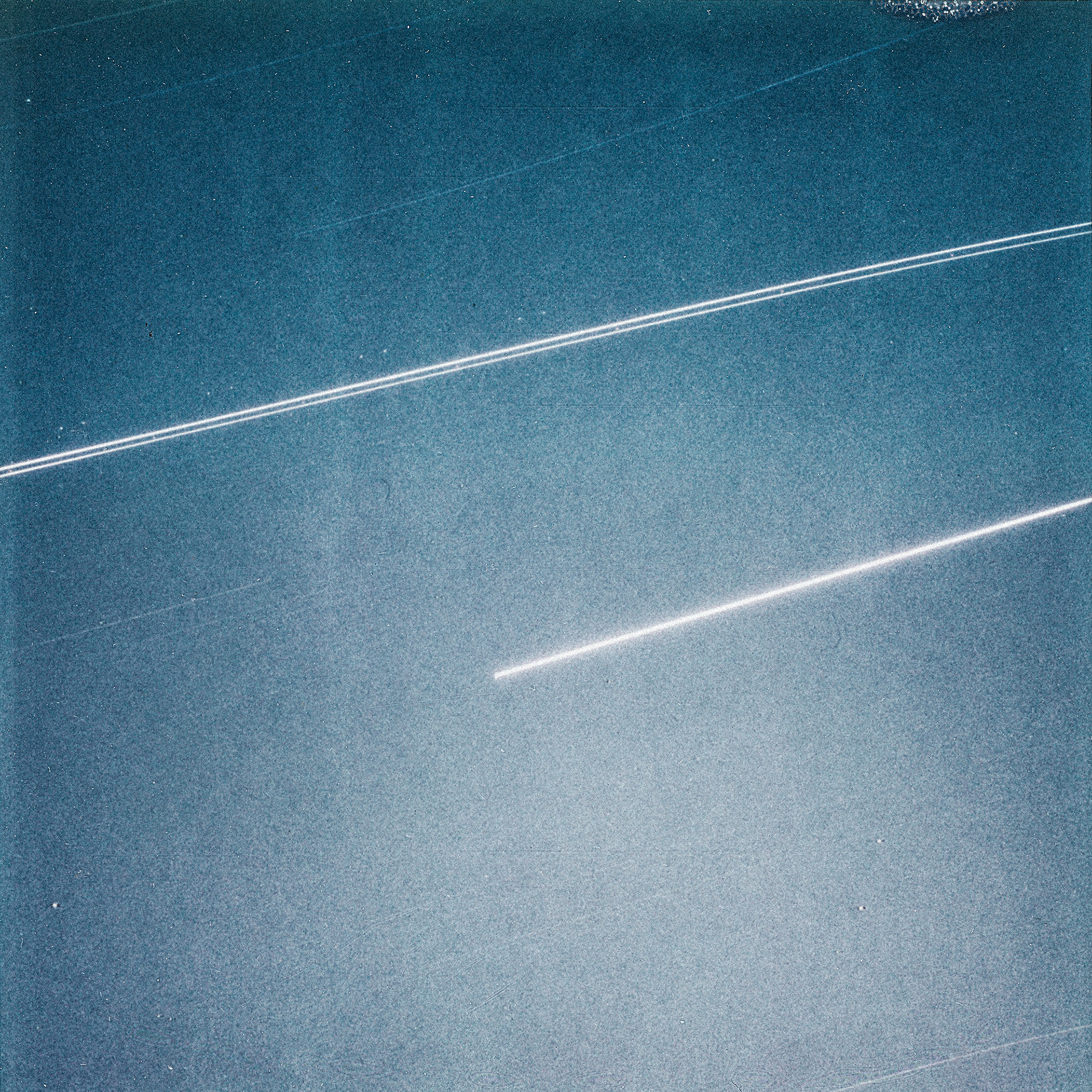 I created these images by taking long exposures with a Polaroid film camera, documenting the paths of the stars and planes over my home in Indiana, paired with specks and curls of dust, and haptic flaws from the analog process. Each exposure is around two hours; a meditative creation process that affords discovery informed in equal parts by our relationship with the natural world, our hasty traversal, and the light pollution that blankets the night sky.